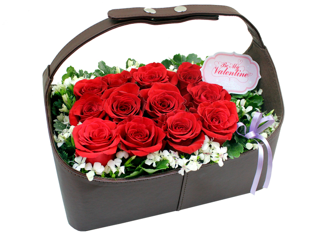 Tastefully arranged 12 South American red roses, with matching flowers in a leather basket.