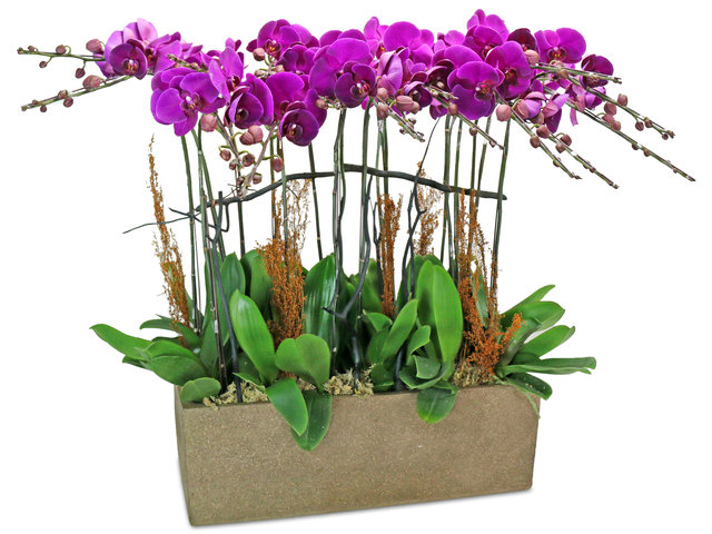 尚礼坊花店精选大型兰花系列,盘身特大,有2尺宽,1尺深,1尺高,由18支大蝴蝶红色蝴蝶兰兰花(有可能因时令而会用如图有些许浅色纹理的品种),加上配衬干枝,放置于兰花用陶瓷盘内。兰花花师专业制作,适合各喜庆场合、家居或公司摆设,大方得体。盛花器皿将因应不同时节及花种作出调整。