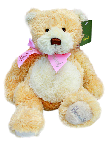 英國名牌Harrods的Natalie Bear, 柔軟可愛的淺棕色泰迪熊坐高9"(約25.5cm高), 配以印有Harrods品牌的粉紅色絲帶, 除了色澤配塔柔和,更有它獨有的身份象徵, 柔軟的質感讓人擁難忘。